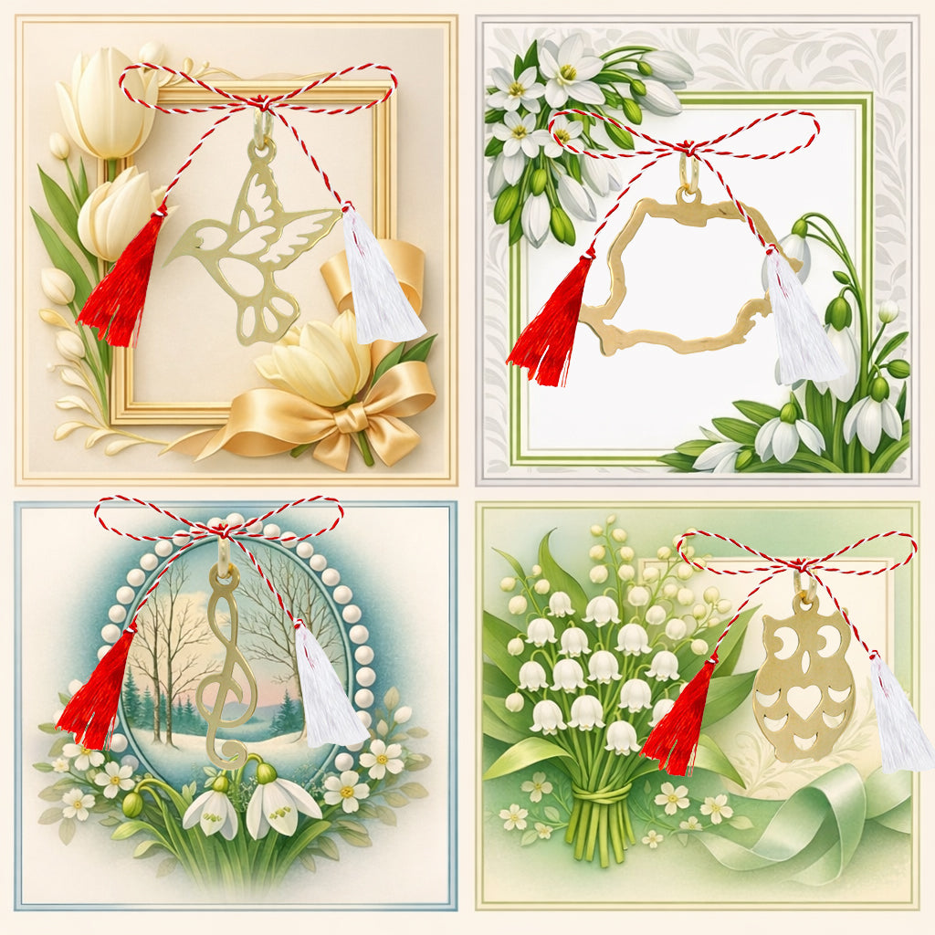 Mărțișoarele sunt însoțite de șnur alb-roșu, simbol al norocului, purității și reînnoirii, și sunt prezentate pe un cartonaș tematic de primăvară, cu un design delicat, ideal pentru a fi oferit cadou.