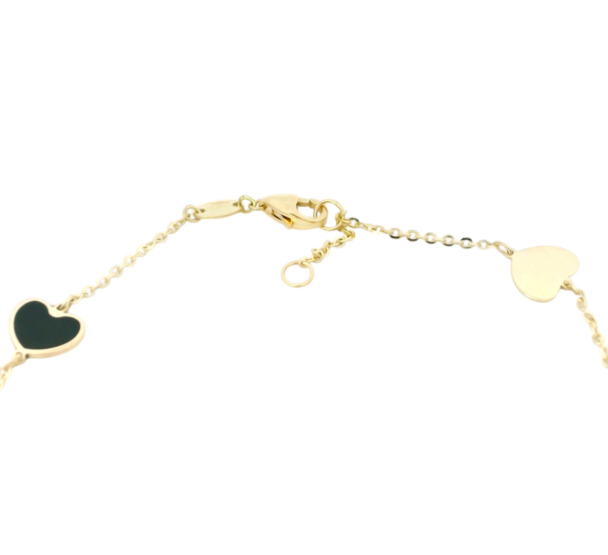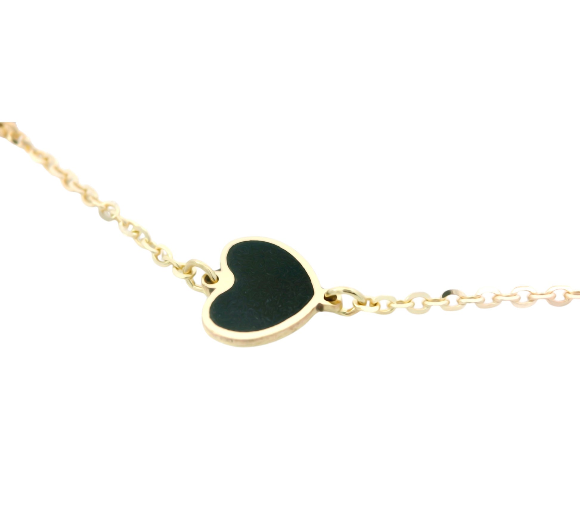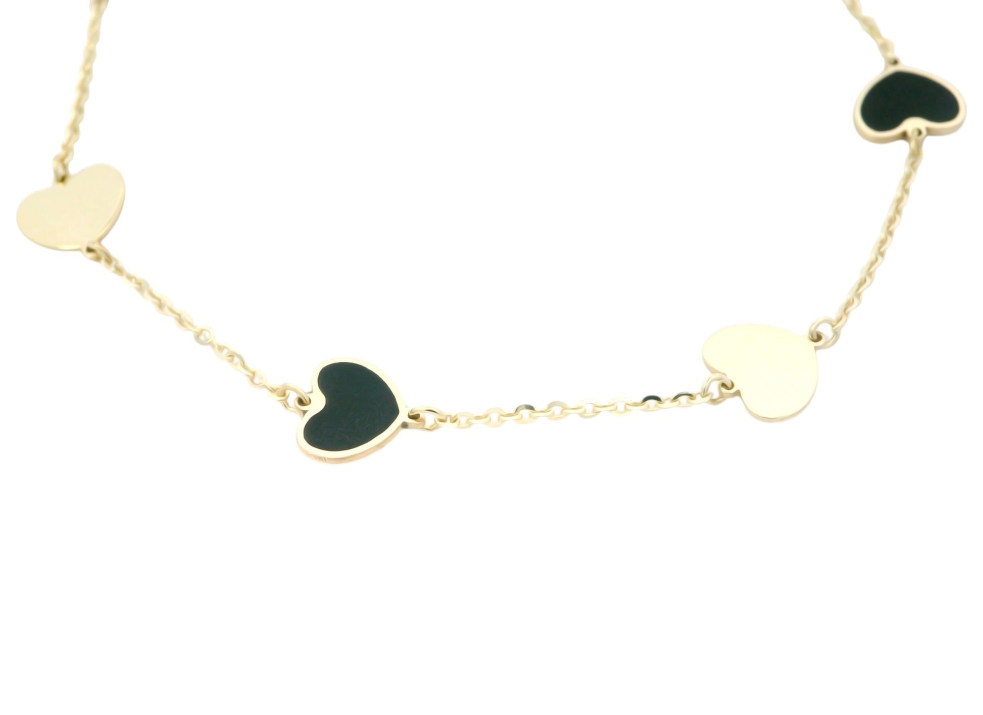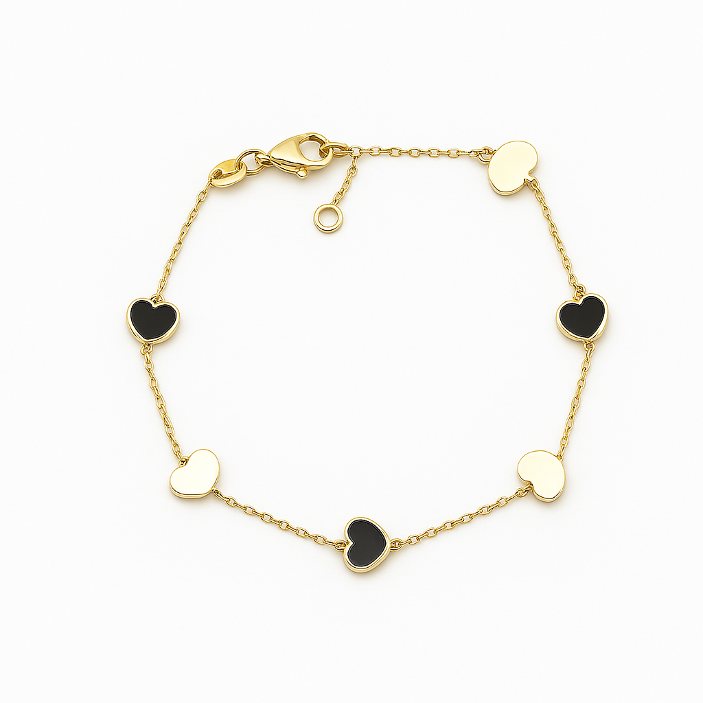 Această brățară din aur cu inimioare este o bijuterie fină și rafinată, creată pentru a exprima eleganță, feminitate și emoție. Designul său delicat este evidențiat de inimi alternante, cu finisaj lucios și detalii contrastante, dispuse armonios pe un lanț subțire din aur.