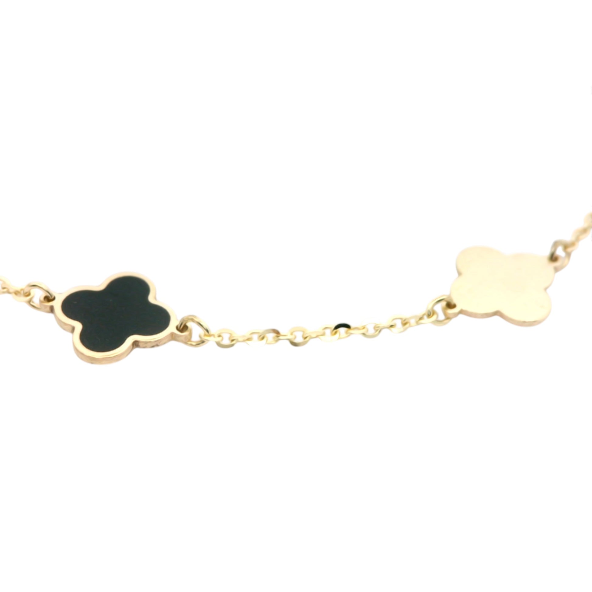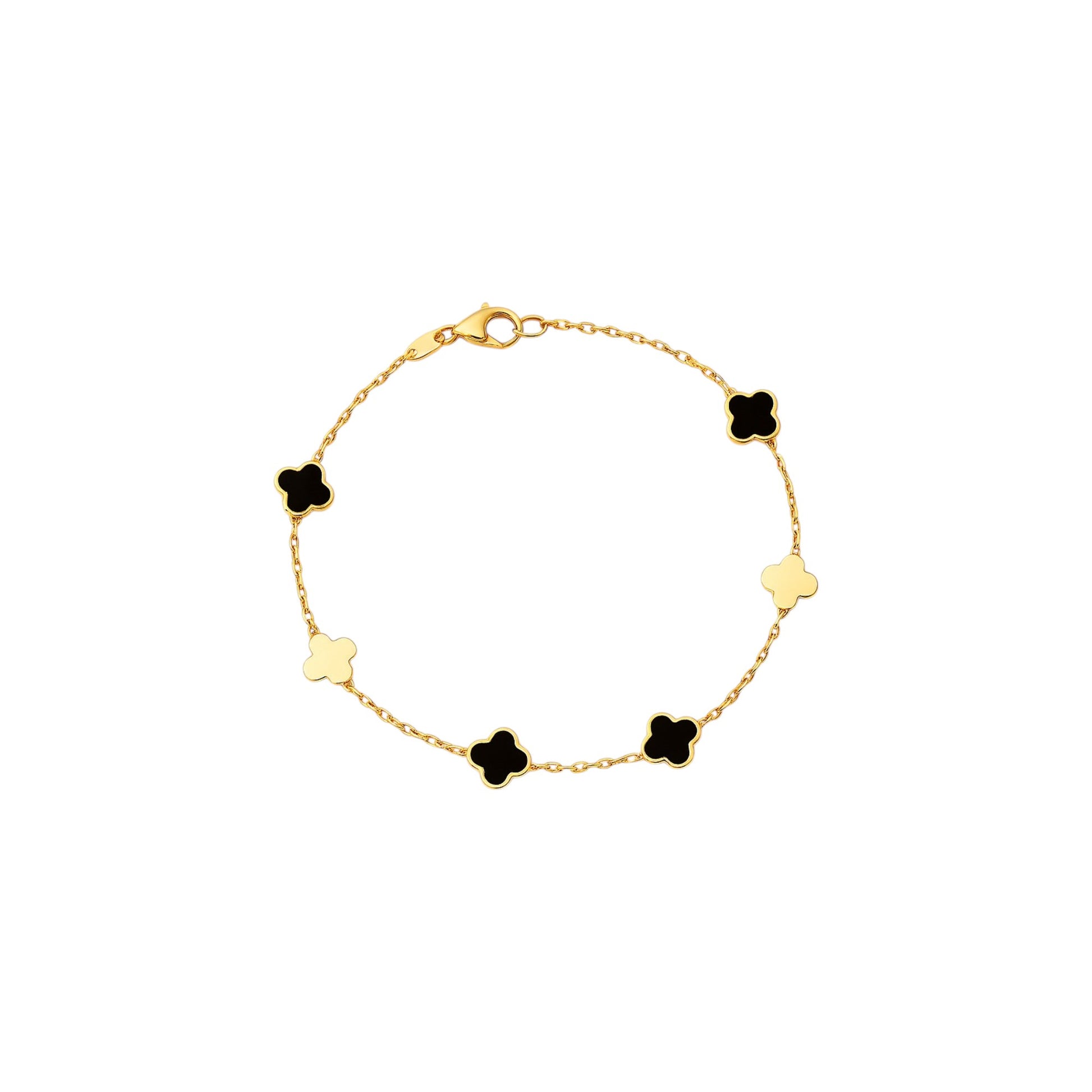 Această brățară din aur se remarcă printr-un design delicat și rafinat, decorat cu pandantive elegante în formă de fluturaș, dispuse armonios de-a lungul lanțului. Alternanța dintre fluturașii aurii și cei cu inserție neagră creează un contrast subtil, oferind bijuteriei un aer sofisticat și feminin.