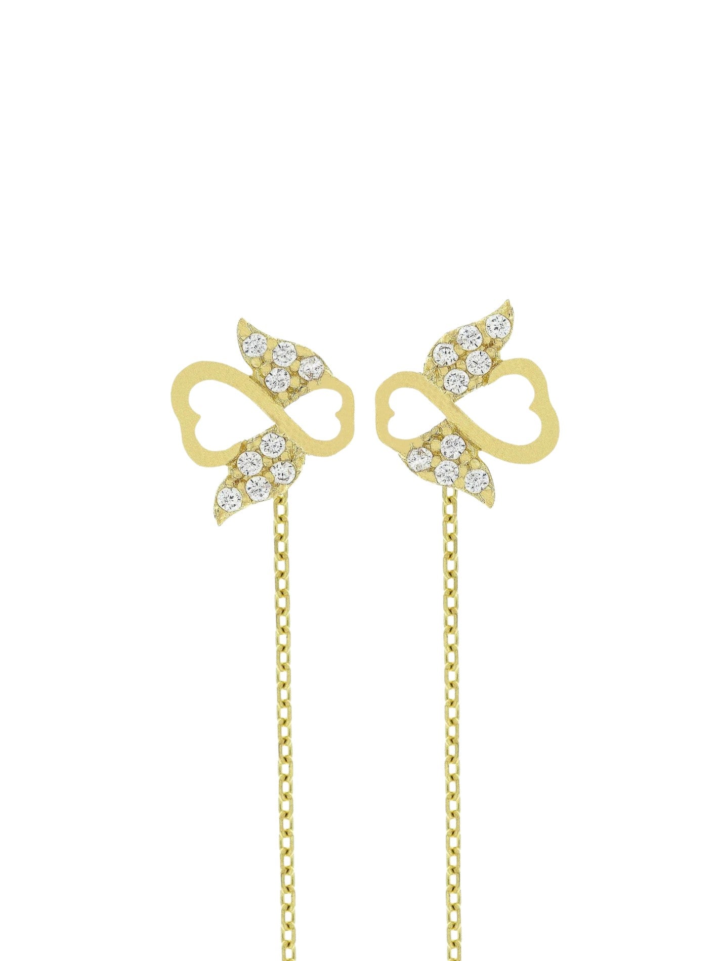 Cercei eleganți din aur, cu lănțișor delicat, având ca element central simbolul infinitului îmbinat cu aripi de înger, decorat cu pietre albe strălucitoare. Designul transmite protecție, iubire eternă și spiritualitate, fiind o bijuterie cu semnificație profundă. Un accesoriu rafinat, ideal pentru a oferi un plus de eleganță și simbolism oricărei ținute.