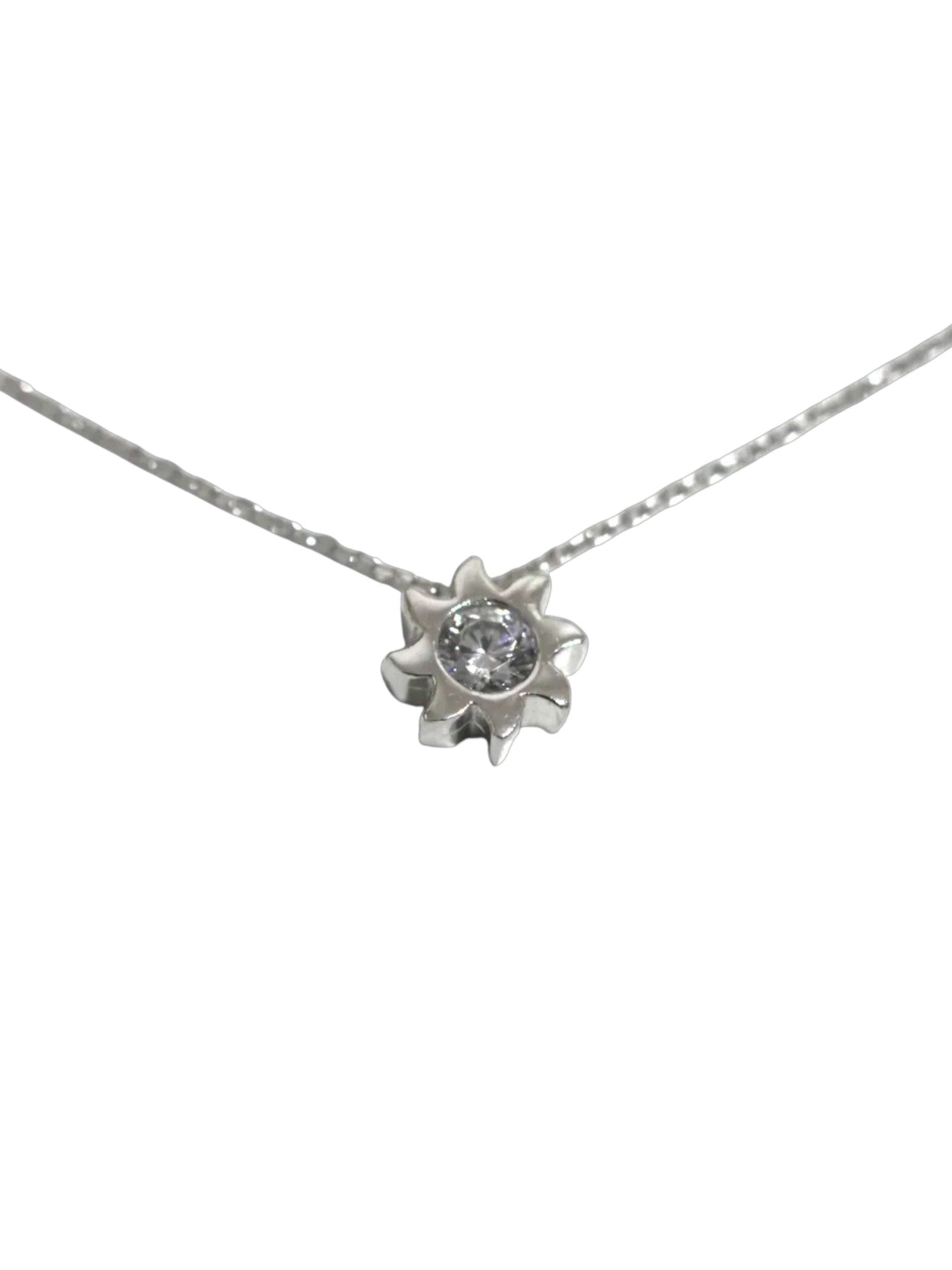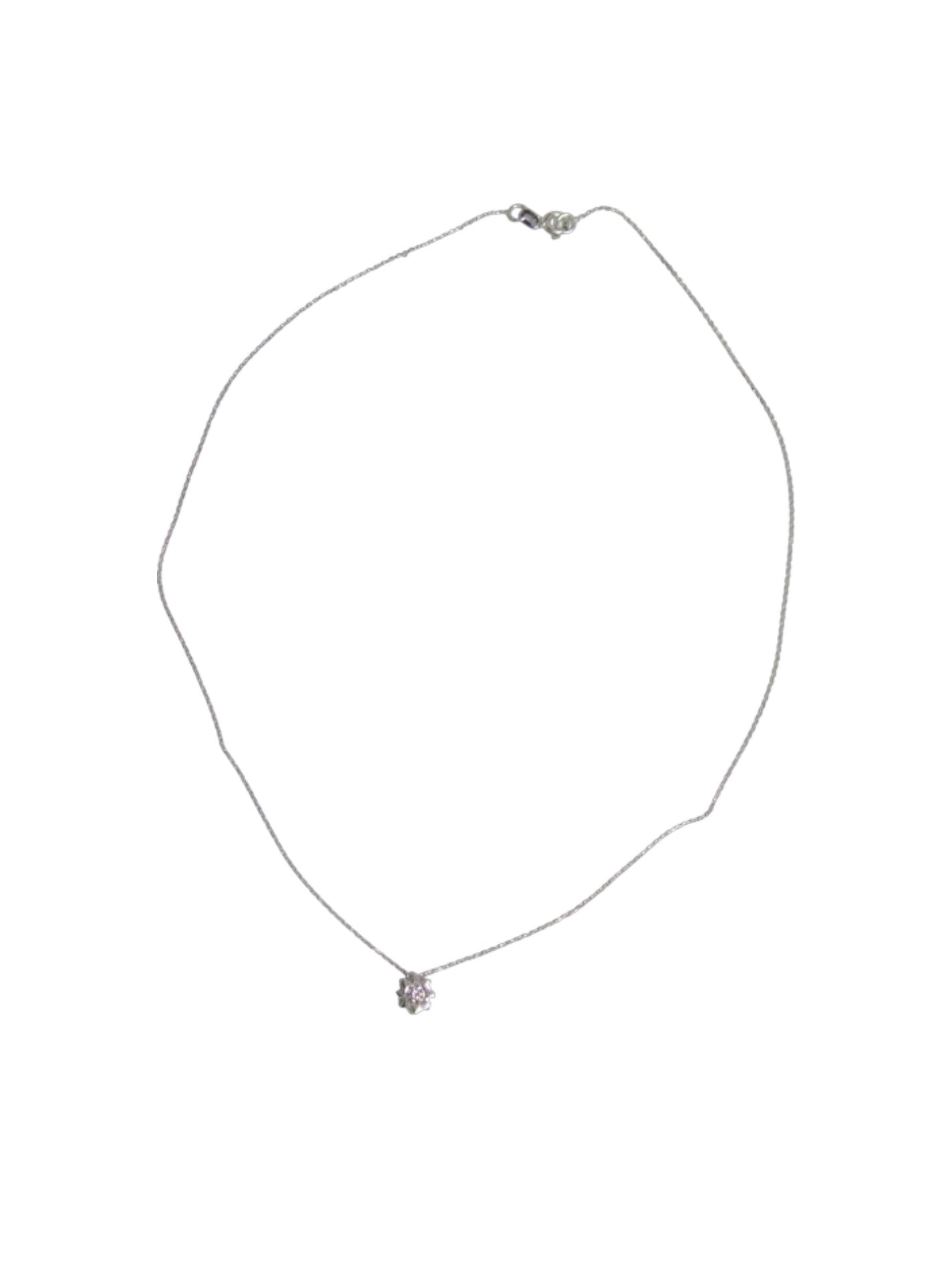 Un lănțișor delicat din aur alb de 14K, conceput pentru a evidenția feminitatea și eleganța purtătoarei. Pandantul, modelat sub forma unei flori stilizate, surprinde prin detaliile fine și conturul armonios. În centrul său se află o piatră strălucitoare, care adaugă un plus de lumină și rafinament întregii bijuterii. Perfect pentru a fi purtat zilnic sau dăruit unei persoane dragi, acest model îmbină simbolismul purității cu strălucirea discretă a aurului alb.