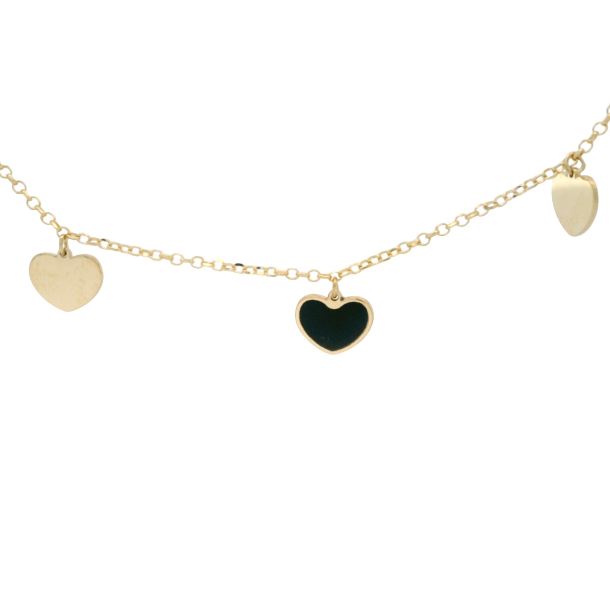 Lantisor delicat în nuanță aurie, decorat cu inimioare negre lucioase și elemente minimaliste. Designul elegant și aerisit oferă un plus de rafinament oricărei ținute, fiind ideal atât pentru purtare zilnică, cât și pentru ocazii speciale. Un accesoriu feminin, ușor de asortat și perfect pentru a completa un look modern.