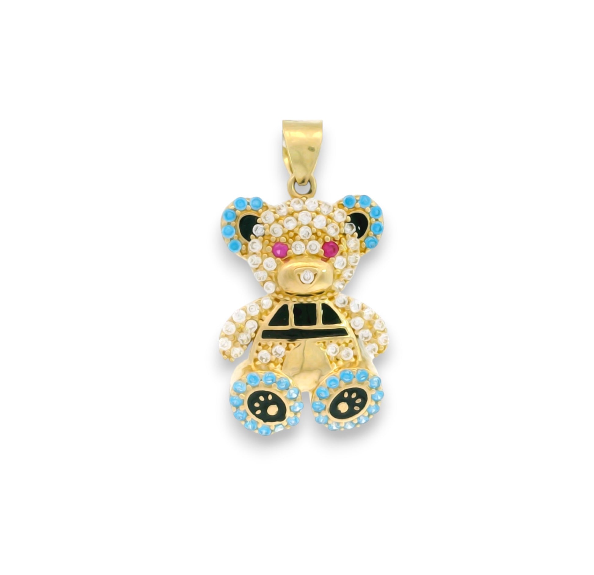 Acest pandantiv adorabil este realizat din aur galben și impresionează printr-un design jucăuș, în formă de ursuleț, decorat cu pietre colorate atent montate. Combinația de pietre albe și accente vibrante în nuanțe de albastru, roz și negru oferă bijuteriei un aspect vesel și strălucitor.
